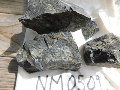 I wanted to share some recent news about rocks with highly anomalous Platinum Group Elements (PGEs) collected from an ultramafic-serpentinite shear zone within one of our licences. As background, the first finding of anomalous PGEs, was in June 2022 (bag R708). In 2023 and 2024 there have been a few more anomalous assays for rocks from the zone, but not as good as R708. Then in the recent collection, two bags of rocks NM507 and NM509, were anomalous. Actually, NM509 had the most anomalous assay yet (platinum 0.123 ppm and palladium 0.128 ppm). I have included a photo of the reference samples for NM509. Previously, I have been looking for rocks in the shear zone that are dense and have blackish spider-web patterns in the serpentinite. But NM509, with the most anomalous PGEs, may be showing something different. The hand specimen looks to be blackish, is a bit metamorphosed, has a bit of layering, and is a bit angular when broken. I hope you can see something in the photos. So, next time I go to the shear zone, I will search for outcropping of rocks with a similar layered (?)hornblendite-like appearance. (7th March 2025)